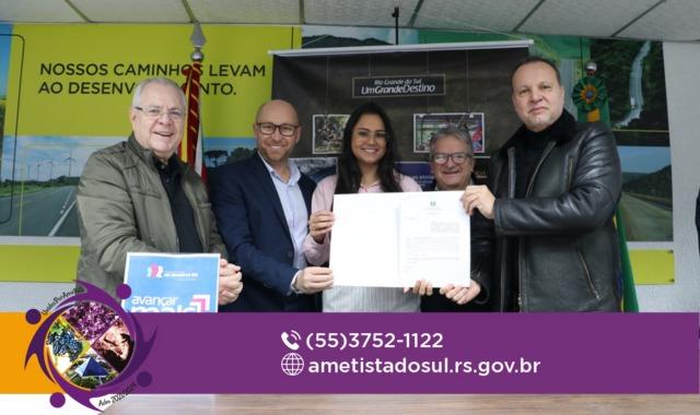 O prefeito de Ametista do Sul, Jadir Kovaleski, a Secretária Municipal de Turismo, Alessandra Colussi, e o Secretário da Saúde, Gilmar Bertuoli, estiveram em Porto Alegre nessa sexta-feira, 05 de julho de 2024, para a assinatura do convênio Avançar Mais Turismo, realizado entre o município de Ametista do Sul e a Secretaria de Turismo do Rio Grande do Sul para instalação de sinalização turística vertical em rodovias, estradas, atrativos turísticos e área urbana.