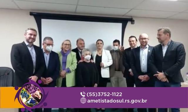 O Prefeito Jadir Kovaleski e o Secretário Adjunto da Saúde de Ametista do Sul e Presidente da Associação Hospitalar São Gabriel, Gilmar Bertuoli, juntamente com a chefe da Coordenadoria Regional de Saúde (CRS), Marly Vendrusculo, participaram nesta terça-feira, 03 de maio de 2022, em Porto Alegre, na presença do Governador Ranolfo Vieira Júnior e a Secretária de Estado da Saúde Arita Bergmann, do ato de anúncio dos novos ambulatórios de especialidades do programa Assistir.